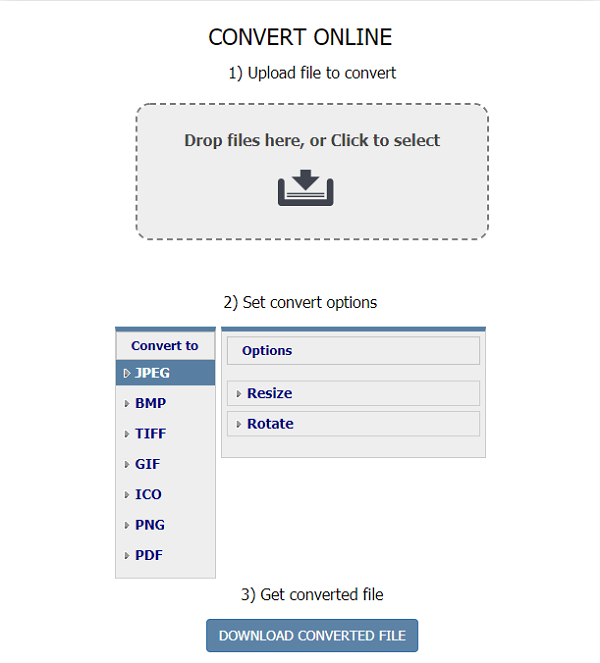 Cet outil peut convertir vos images en temps réel, contrairement à d'autres convertisseurs en ligne d'images. Cela signifie que vous n'avez pas besoin d'attendre un lien e-mail. Parmi les fonctionnalités les plus remarquables de cette application, vous pouvez redimensionner et faire pivoter vos images avant de les convertir. Surtout, puisqu'il s'agit d'un convertisseur en ligne, il fonctionne avec presque tous les systèmes d'exploitation tels que Mac, Linux et Windows.